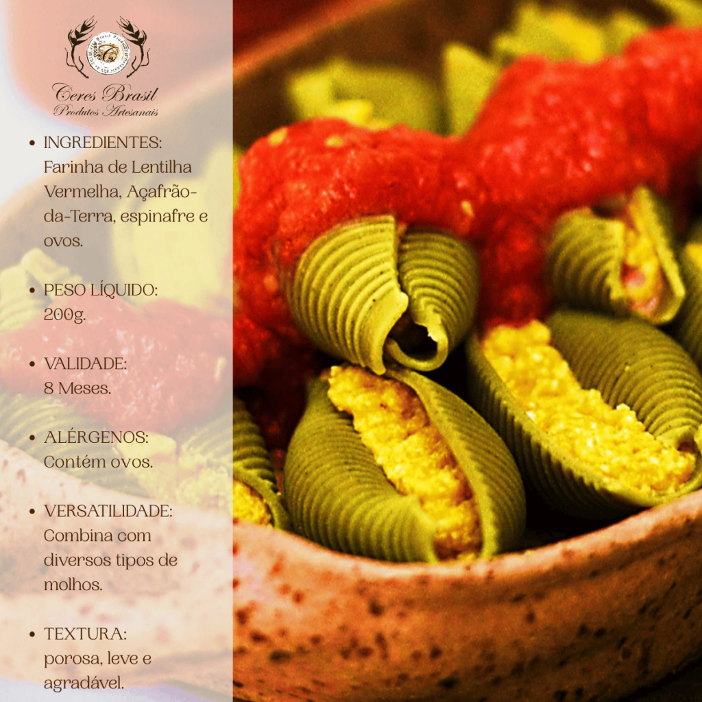 O Conchiglione Ceres Brasil foi desenvolvido para quem busca saúde, sabor e sofisticação em um único prato. Produzido com farinha de lentilha e espinafre natural, é uma massa nutritiva, de fácil digestão e com textura leve.